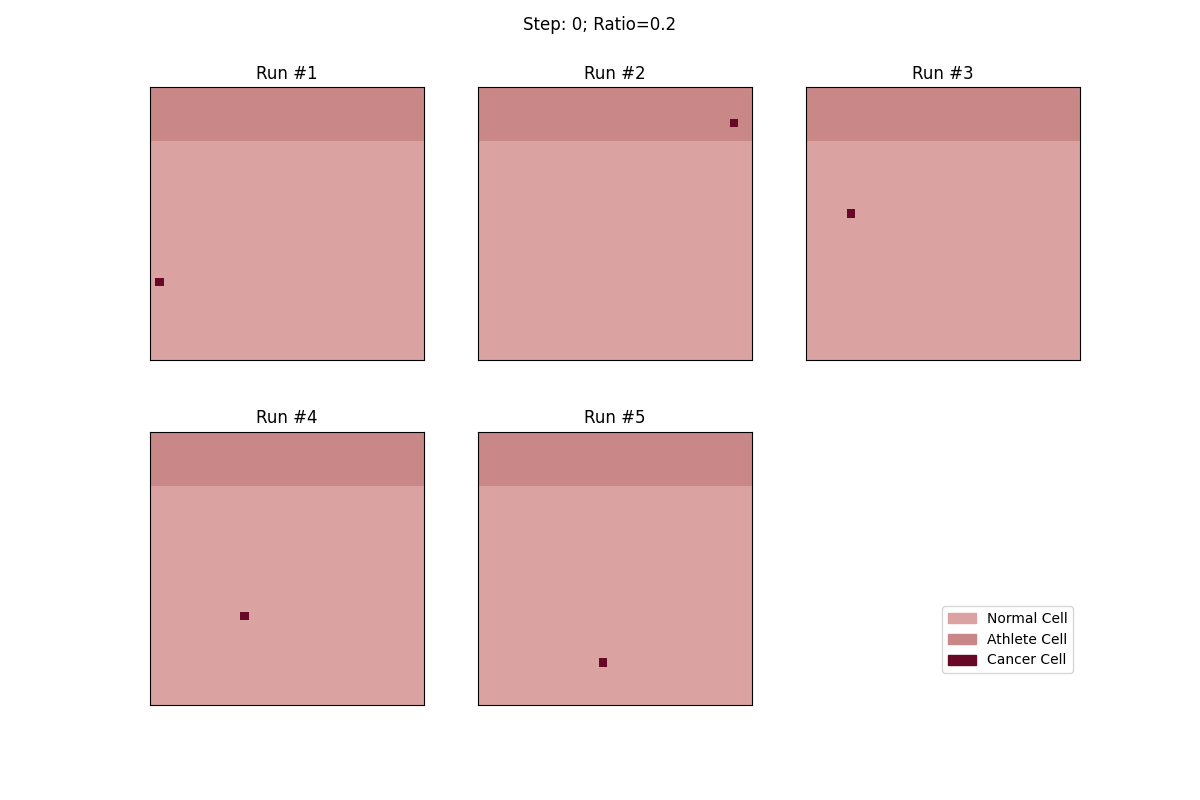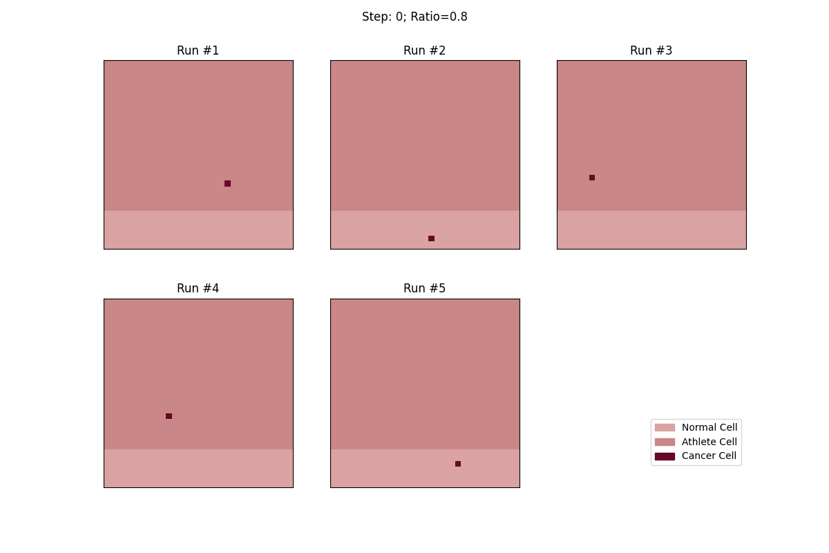 Cellular automata with a 20% ratio of athlete cells. The tumor in the athlete region (Run #2) doesn't spread over time, but all the other tumors, given enough time, eventually spread and take over.