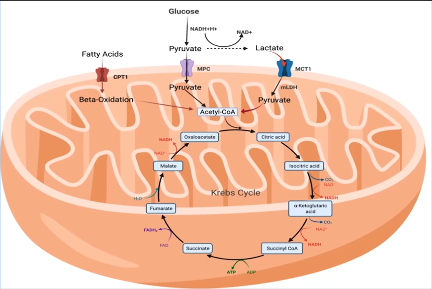 We all studied in high school that the mitochondria are the powerhouse of the cell. But it's been a while since I opened a biology textbook, so let's recap a little bit. The mitochondria's job is basically to produce ATP (Adenosine Triphosphate), which for our intents and purposes is just "energy". So what are some of the ways it can create energy? The most common way is glycolysis, which is the process where glucose from your blood enters the cell, gets converted to pyruvate, which gets converted to Acetyl-CoA, which then enters the Krebs cycle and eventually creates ATP. Now, a byproduct of this process is lactate. In regular individuals, this lactate enters the blood and stays there. However, in really fit individuals, like athletes, this lactate can be shuttled back into the mitochondria with special transporters called MCT1 to create even more ATP!
